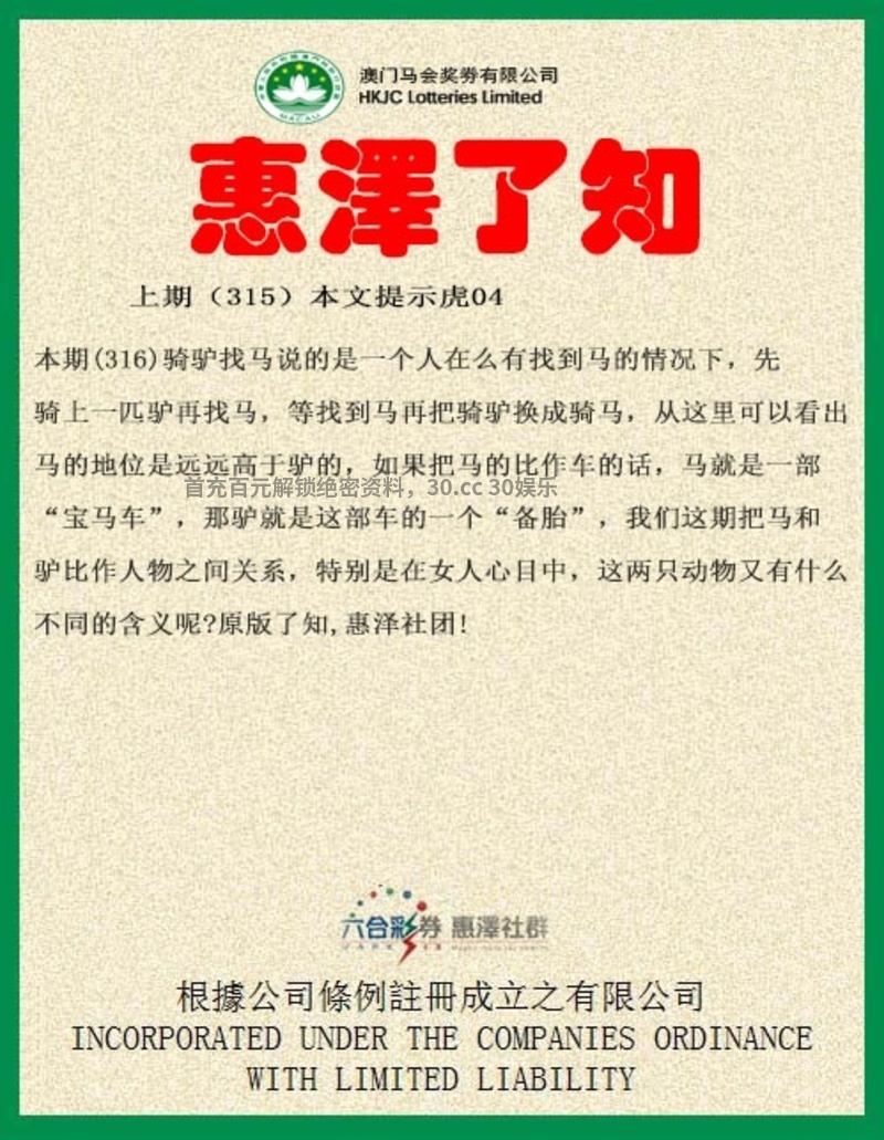 | [惠泽了知] 316期:骑驴找马说的是一个人在么有找到马的情况下,先骑上一匹驴再找马,等找到马再把骑驴换成骑马,从这里可以看出马的地位是远远高于驴的,解明肖马。如果把马的比作车的话,马就是一部“宝马车”,解地肖鼠虎蛇羊鸡狗。那驴就是这部车的一个“备胎”,我们这期把马和驴比作人物之间关系,特别是在女人心目中,解女肖兔蛇羊鸡猪。这两只动物又有什么不同的含义呢? [惠泽九肖]:马鼠虎蛇羊鸡狗兔猪 [惠泽六肖]:马鼠虎蛇羊鸡 [惠泽三肖]:马鼠虎 [惠泽一肖]:马 [惠泽平肖]:马马马 |
