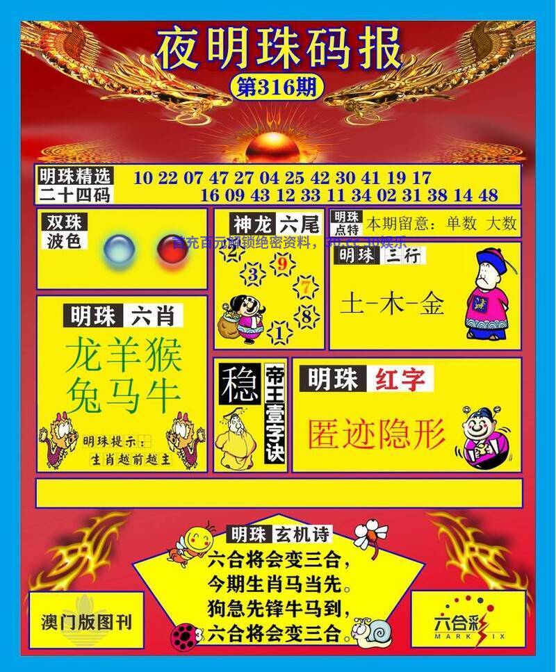 | 316期:玄机诗 六合将会变三合,今期生肖马当先。狗急先锋牛马到,六合将会变三合。 精选六肖:龙羊猴兔马牛 |
